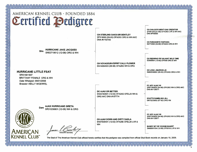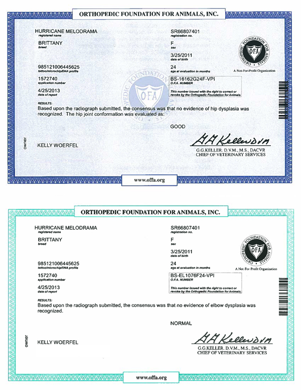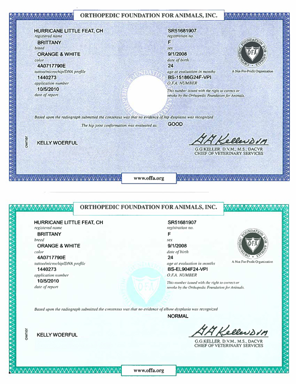 DAM: CH. Hurricane Little Feat (Tiny), OFA Good