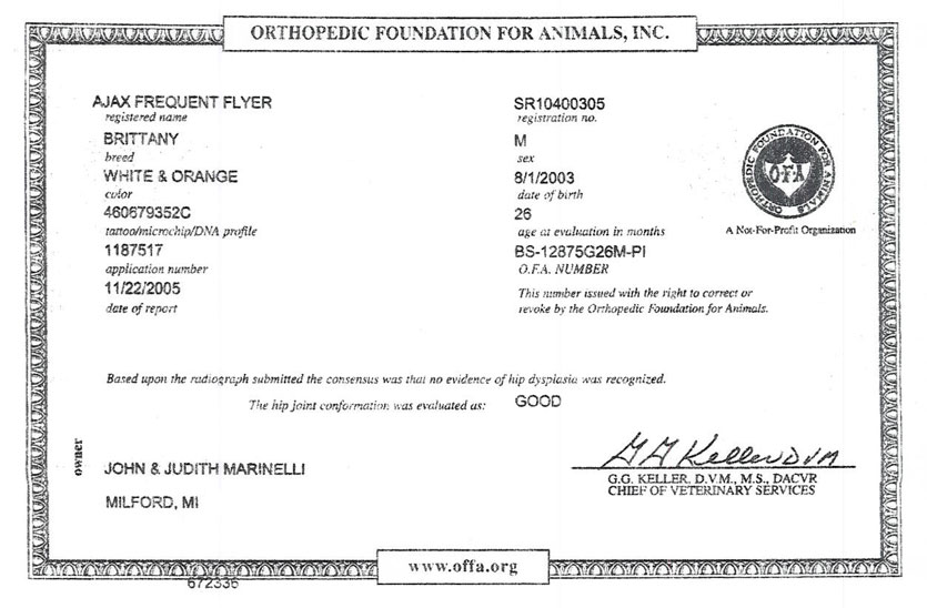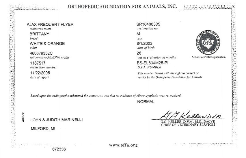 DAM: CH. Hurricane Little Feat (Tiny), OFA Good